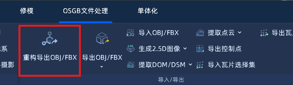 打开文件或工程后,右键点击矢量或地块后,点击 菜单栏 -> 导入/导出 -> 重构导出OBJ/FBX 按钮,即可打开重构导出对话框。