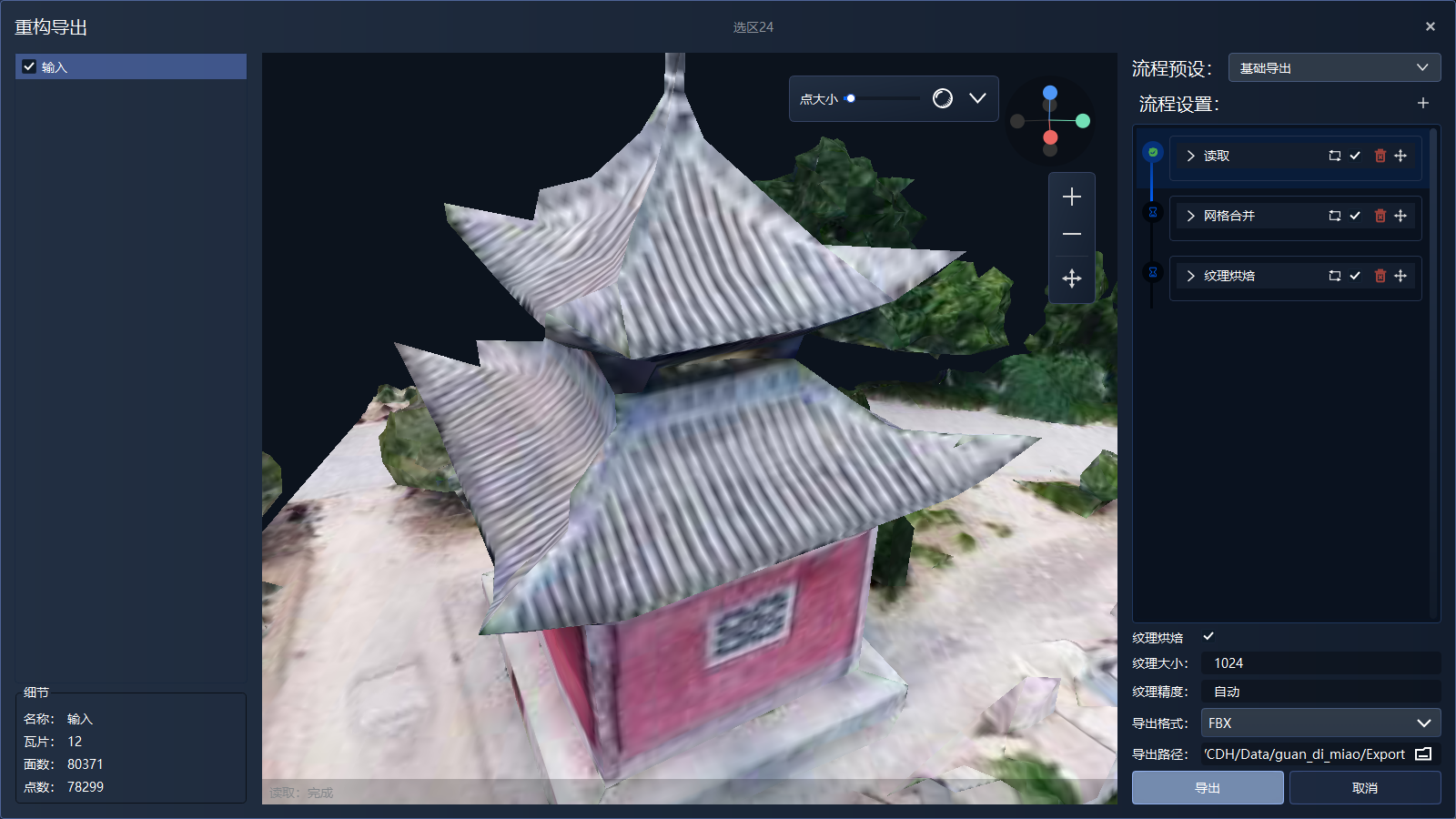• 包含步骤:读取 → 采样 → 推进前沿重建 → 纹理烘焙 → 导出